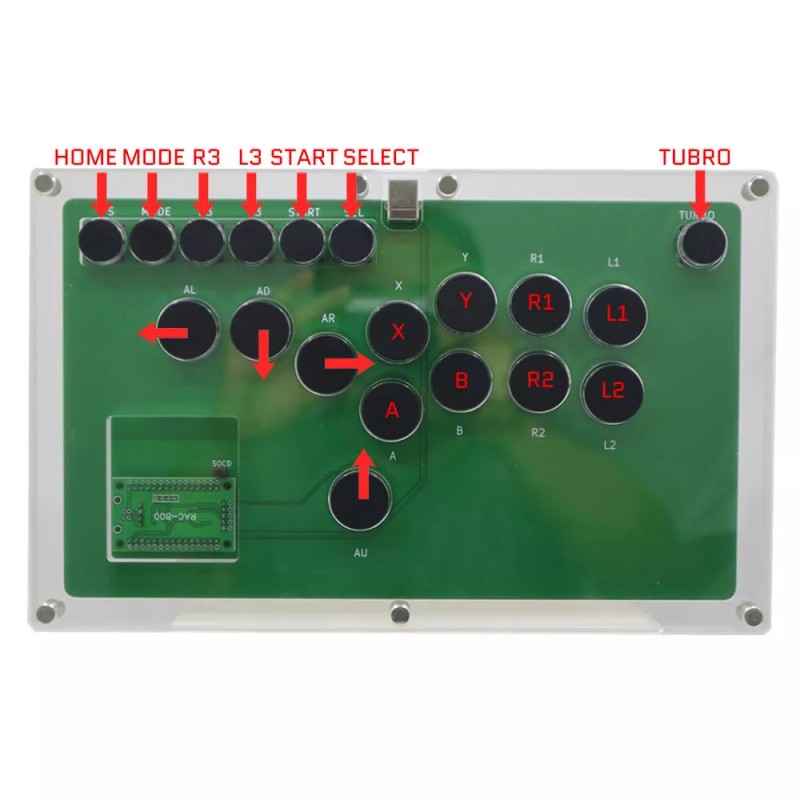 The FightBox B1-PC-DIY is using all-acrylic ultra-thin design, the thickness is less than 2cm, and the layered structure allows users to place their own artwork paper on the panel. It has 4x24mm buttons(Cherry MX Black key switches) on the left side of the controller, instead of the traditional analog joystick, with 8x24mm buttons(Cherry MX Black key switches) for the action buttons on the right side of the controller.  Using hot-swappable technology, it is convenient for users to replace their favorite mechanical key switches. The FightBox B1-PC-DIY is compatible with PC/Android by using Zero Delay Arcade USB Encoder.
