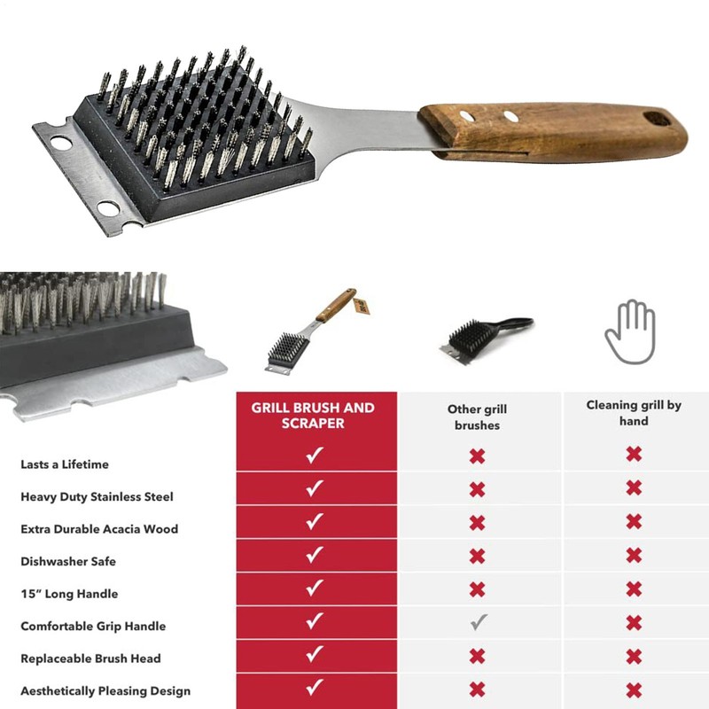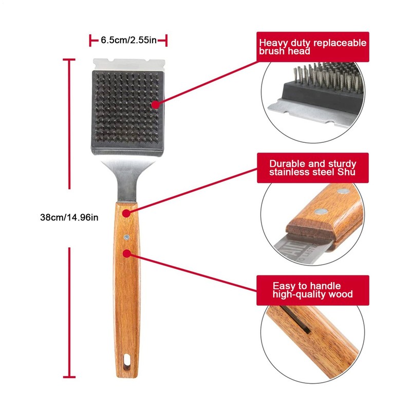 Easy to Store: Storing and keeping your BBQ grill brush and scraper clean has never been easier. The lightweight wood handle allows for hassle-free suspension with a neat look using the suspend loop on top.