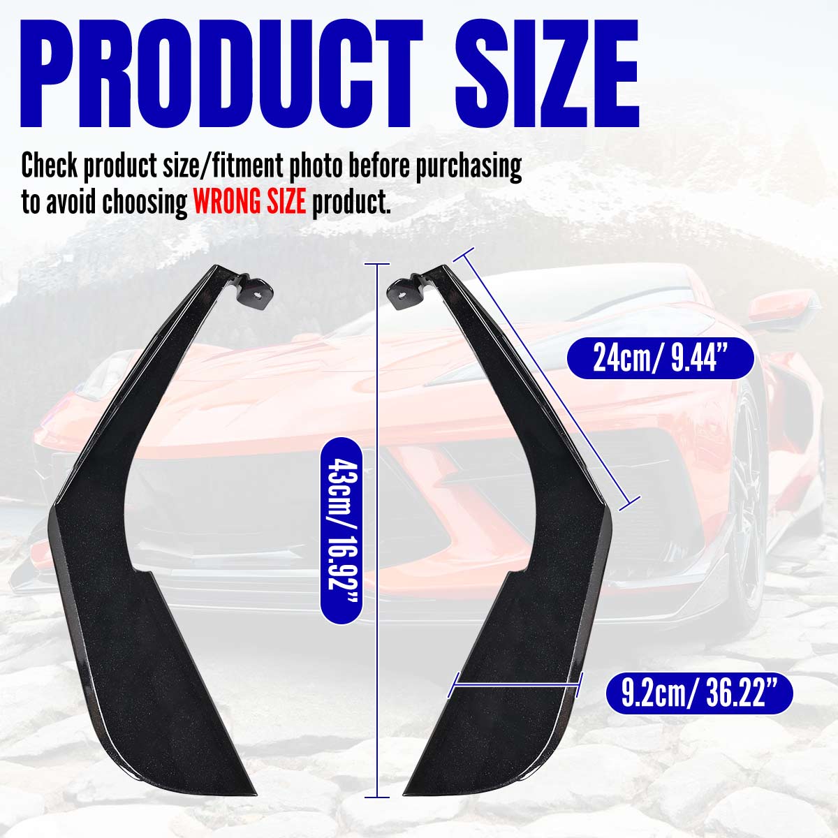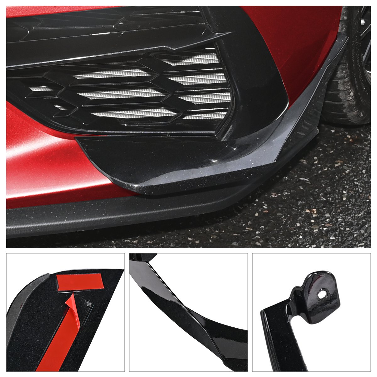 1.Premium Material: This front bumper splitters for Corvette C8 are made of high quality and light weight ABS Plastic, with polished and shinning surface and UV-Protected Clear Coating, high strength, impact resistance fade.