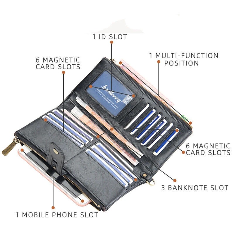 This men's zipper wallet rfid has 3 large cash pocket,1 mobile phone slot,1 id windows,1 zip coin purse,12 credit card slots, keep your credit cards,cash,coins,and checkbook in order.