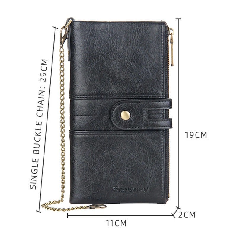Zipper wallet with removable chain to keep your wallet from being stolen. The rfid wallet allows quick and easy access to your cards and money.