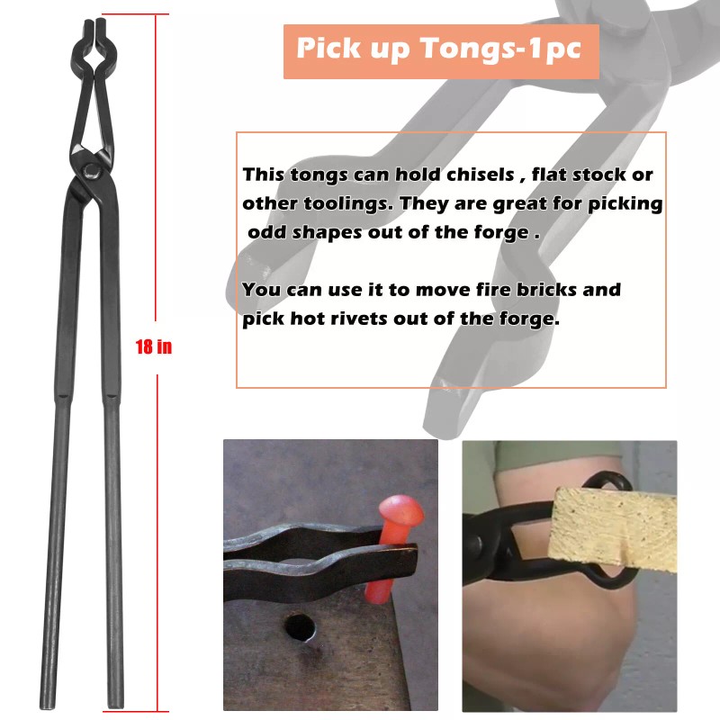 - Pick Up Tongs--Designed for holding thin flat stock and chisels, and also for pulling hot stock out of forging. You can use it to move fire bricks and pick hot rivets from the fire.