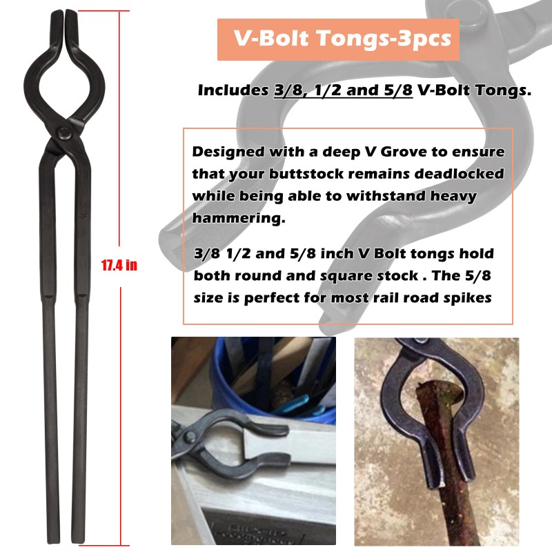 - V-Bit Tongs--Contains 3/8, 1/2, 5/8 inch V-Bit tongs. Designed with deep V Groves in the jaw to ensure that your flat stock remains deadlocked while being able to withstand heavy hammering. It's very suitable for handling various round and square stock. The 5/8 size is perfect for rail road spikes.