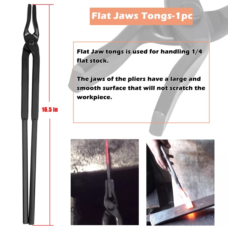 - 1/4 Flat Jaw Tongs--For 1/4 inch flat stock. The jaw surface of the tongs is large and smooth that won't scratch the workpieces. This tong is easier to handle when working with smaller materials.
