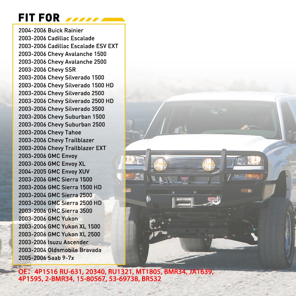 Fit for: For 2004-2006 Buick Rainier For 2003-2006 Cadillac Escalade For 2003-2006 Cadillac Escalade ESV EXT For 2003-2006 Chevy Avalanche 1500 For 2003-2006 Chevy Avalanche 2500 For 2003-2006 Chevy SSR For 2003-2006 Chevy Silverado 1500 For 2003-2006 Chevy Silverado 1500 HD For 2003-2004 Chevy Silverado 2500 For 2003-2006 Chevy Silverado 2500 HD For 2003-2006 Chevy Silverado 3500 For 2003-2006 Chevy Suburban 1500 For 2003-2006 Chevy Suburban 2500 For 2003-2006 Chevy Tahoe For 2003-2006 Chevy Trailblazer For 2003-2006 Chevy Trailblazer EXT For 2003-2006 GMC Envoy For 2003-2006 GMC Envoy XL For 2004-2005 GMC Envoy XUV For 2003-2006 GMC Sierra 1500 For 2003-2006 GMC Sierra 1500 HD For 2003-2004 GMC Sierra 2500 For 2003-2006 GMC Sierra 2500 HD For 2003-2006 GMC Sierra 3500 For 2003-2006 GMC Yukon For 2003-2006 GMC Yukon XL 1500 For 2003-2006 GMC Yukon XL 2500 For 2003-2006 Isuzu Ascender For 2003-2004 Oldsmobile Bravada For 2005-2006 Saab 9-7x
