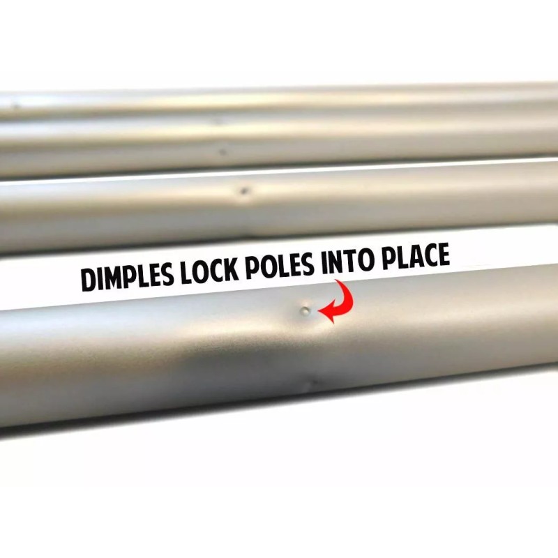 Pole is 16ft tall and breaks down to 5 pieces (4 straight, 1 curved). Base Diameter 1.125in.