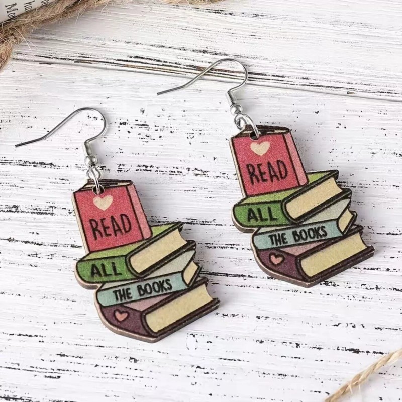 The perfect gift for bookworms, teachers, or librarians! These wooden dangle drop earrings feature a stack of books and the text “read all the books.”