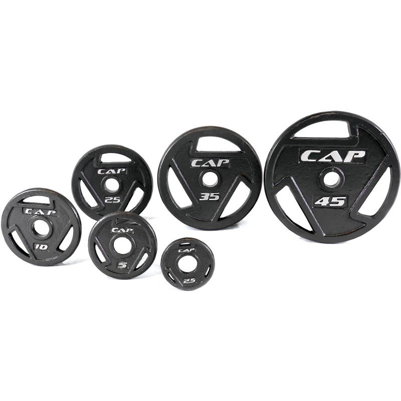 The CAP Barbell Black Grip Plates are an exceptional choice for your weightlifting routine. These weights will last for years to come. The enamel finish provides a durable coating that prevents the weight from chipping and rusting. Each weight plate is also designed with convenient grips to provide a secure grip when loading them onto the bar. Designed to fit on style bars, each weight has a 2-inch center hole. Each weight is sold individually, so buying them in pairs will ensure an even weight distribution on your bar. Use the weights for strength training or for cardiovascular movements. Adding these Grip Plates for resistance training will help you achieve your fitness goals faster, build muscle, and burn more calories.
