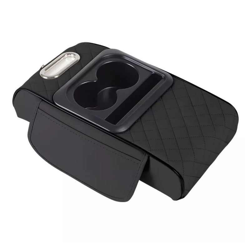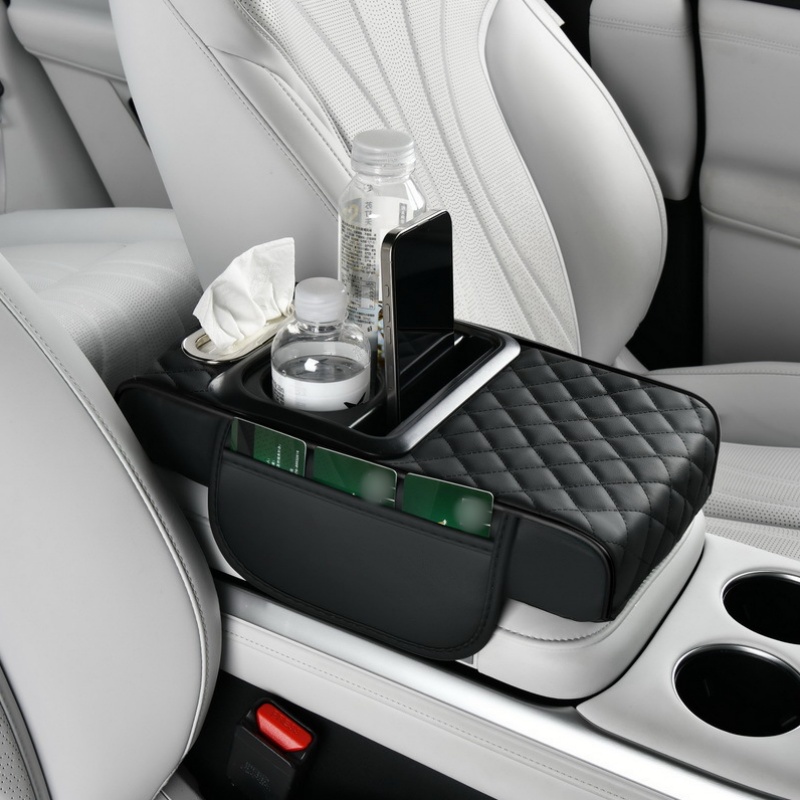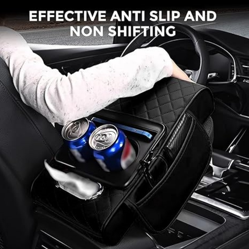 Multi-functional design: our car console covers is multi-functional, tissue bag (6.3*2.7*2.7inch), two side pockets (7.8*3.1inch), 2 cup holders (2.8inch diameter each), and also gives you a place to relax your arms.