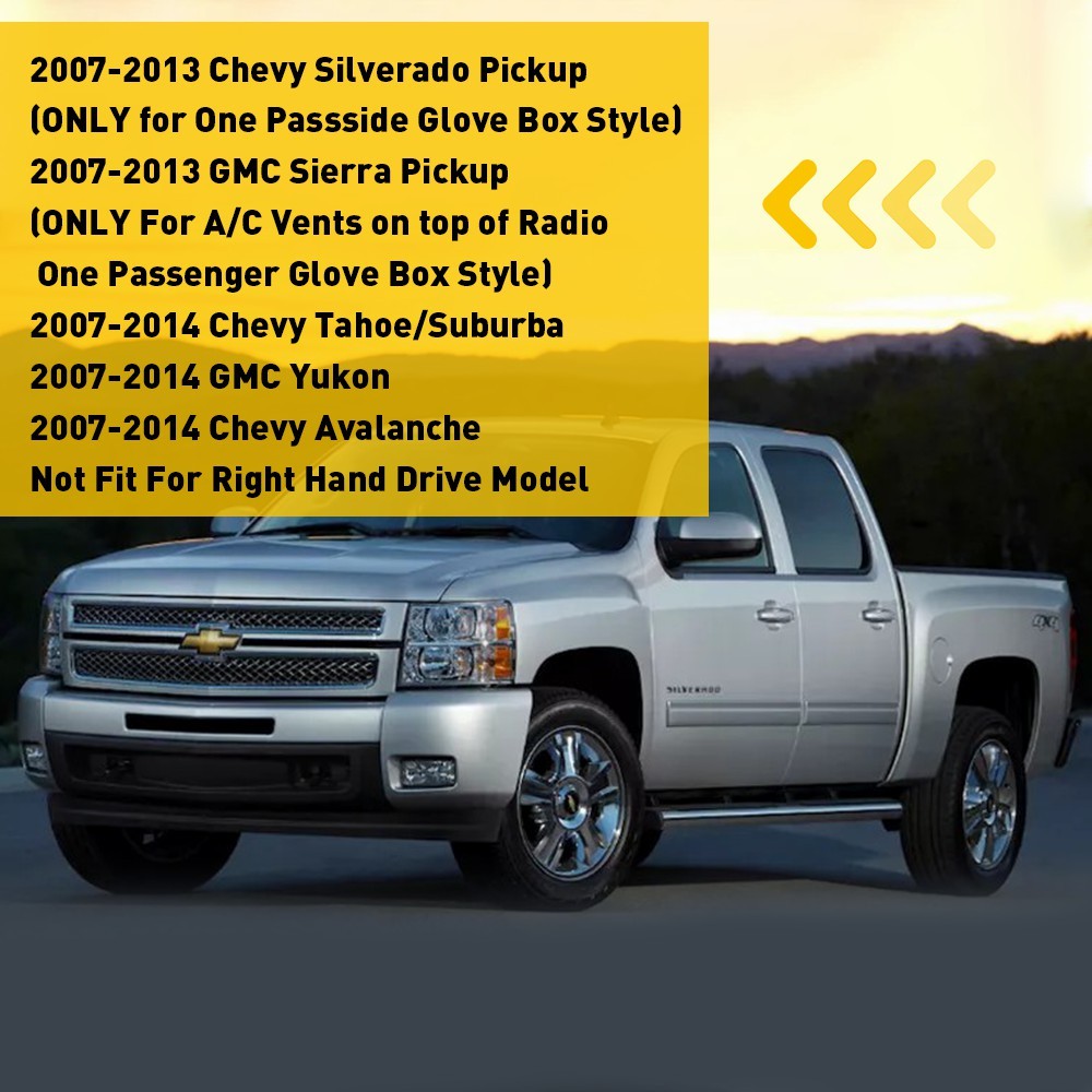 Fit for: 2007-2013 Chevy Silverado Pickup (ONLY for One Passside Glove Box Style) 2007-2013 GMC Sierra Pickup (ONLY For A/C Vents on top of Radio, One Passenger Glove Box Style) 2007-2014 Chevy Tahoe/Suburba 2007-2014 GMC Yukon 2007-2014 Chevy Avalanche (ONLY FOR LEFT HAND DRIVE MODEL, NOT FIT RIGHT HAND DRIVE MODELS.) For the year and models, please check the compatibility!