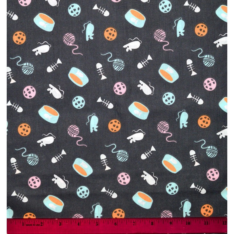 Fabric features a scattering of cat toys on a medium gray background. Mice, yarn, balls, and fish bones are all shown in pastel colors of blue, pink, orange, and white.