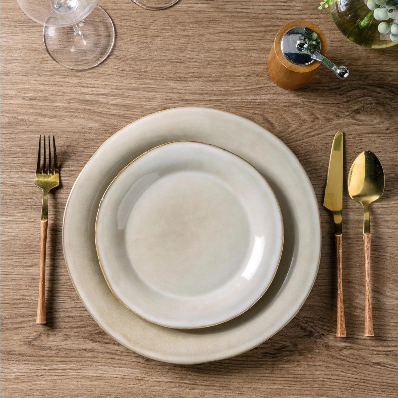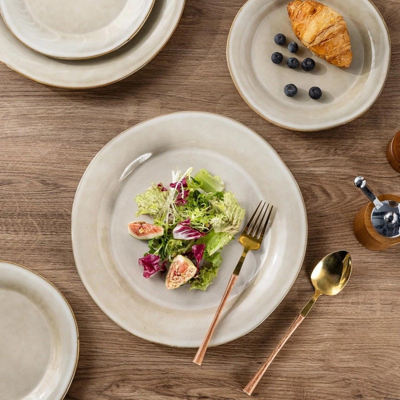 - EVERY PLATE IS UNIQUE: This dinnerware set is fired with two different glazes, so the surface develops a beautiful color and makes your food look even more delicious. Since our glaze is all-natural, the surface of the plates would change color in different lighting. The color may be a tad different from what you see in the images, but every item is beautiful. Our glaze is also extra strong to prevent scratches from your knives and forks