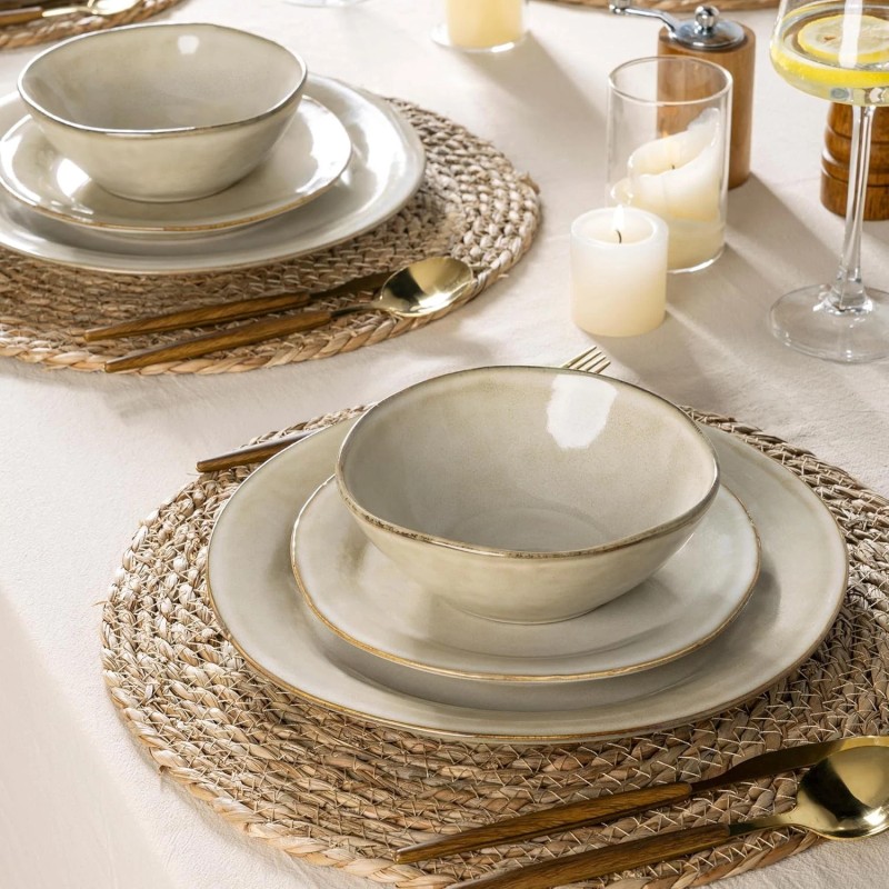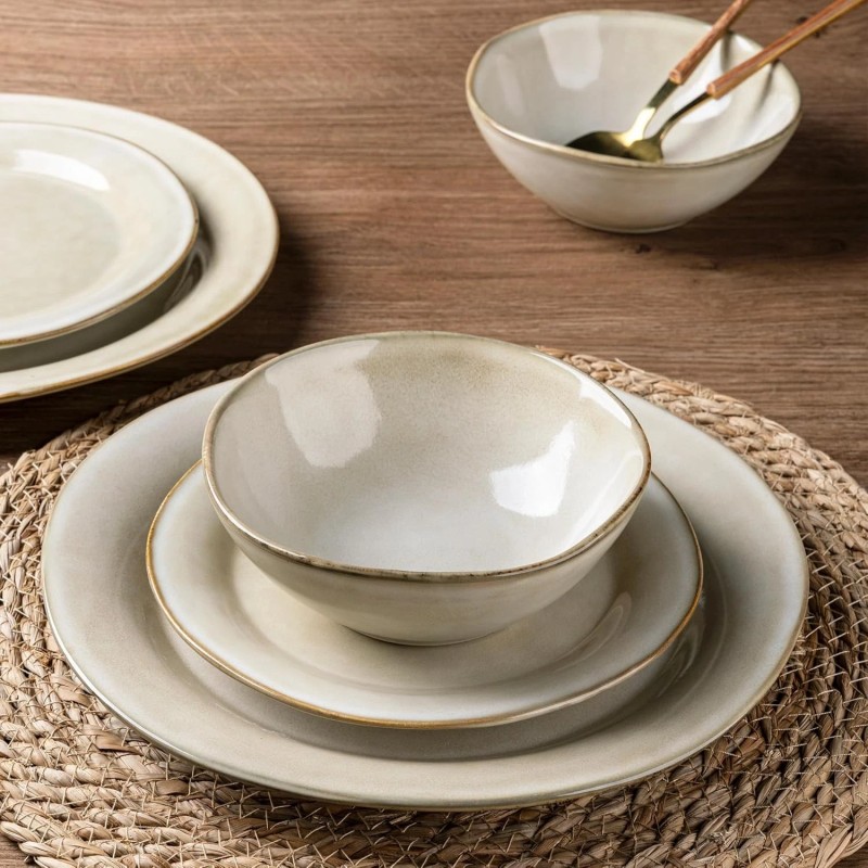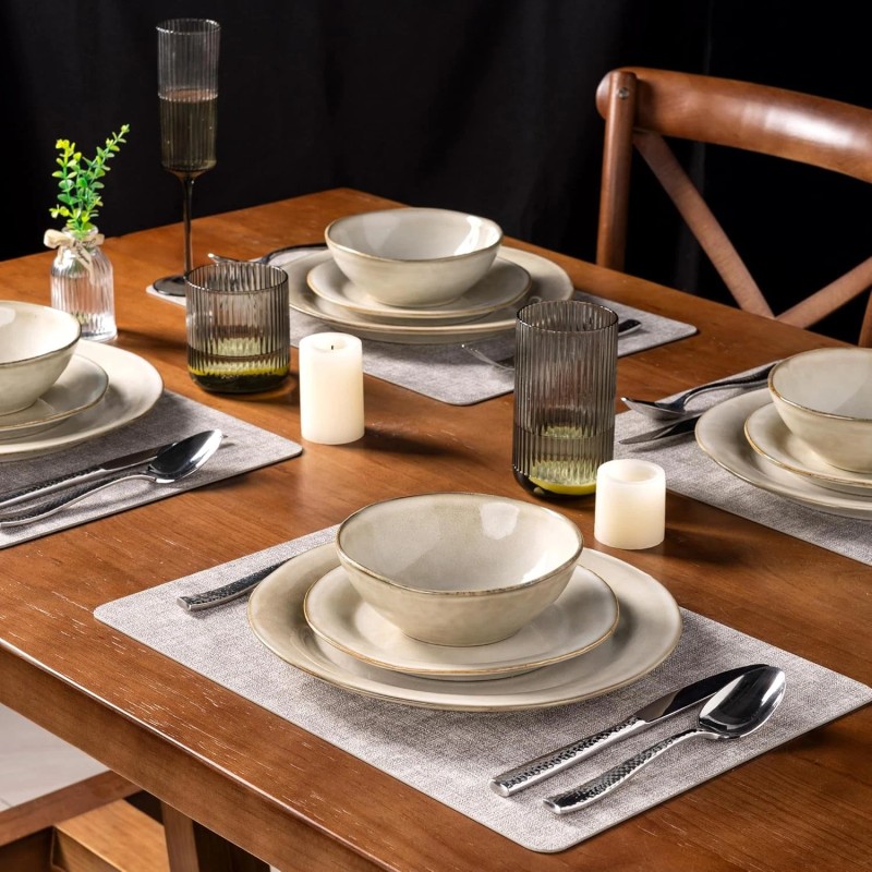 - HANDMADE AND MULTI-PURPOSE: Our 12-piece ceramic dinnerware set is handmade with a unique reactive glaze and gently undulating edges, offering a charming, artisanal feel. You can stack and nestle them nicely in your cupboard or on your shelves. Our Dinnerware set is microwave, dishwasher, and freezer safe, Perfect for everyday use, indoors or out, and ideal for any kitchen. It makes your food look even more delicious and makes you happy every day.