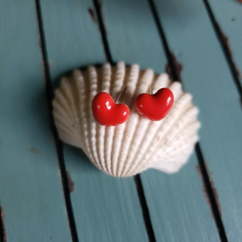 Ceramic Red Heart Sterling Silver 925 Stud Earrings.