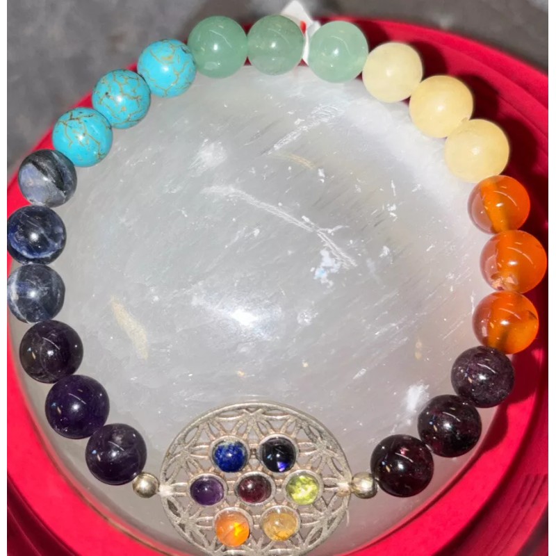 Enhance your spiritual wellbeing with this captivating chakra bracelet featuring the Flower of Life design. This beaded bracelet showcases a stunning flower-shaped charm that exudes an enchanting beauty. Crafted with utmost care, this bracelet is perfect for those who seek to balance their chakras and achieve inner harmony.