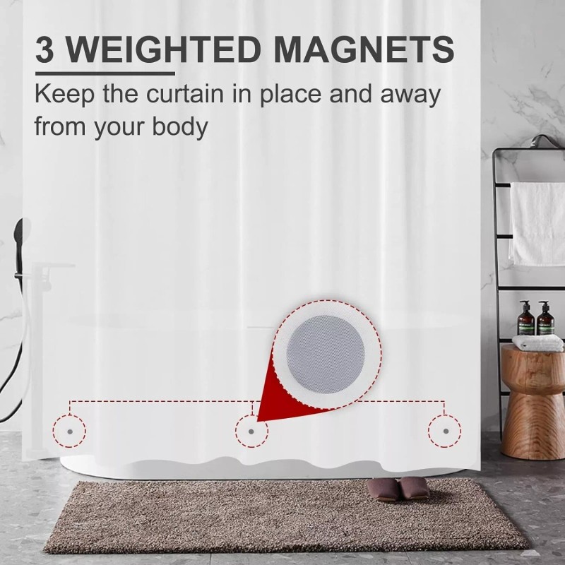 - No More Blowing Curtains - The three weighted magnets at the bottom of the frosted shower curtain liner reduce blowing, making it perfect for use in your home, campers, motels, hotels, dorms, and camp trailers.