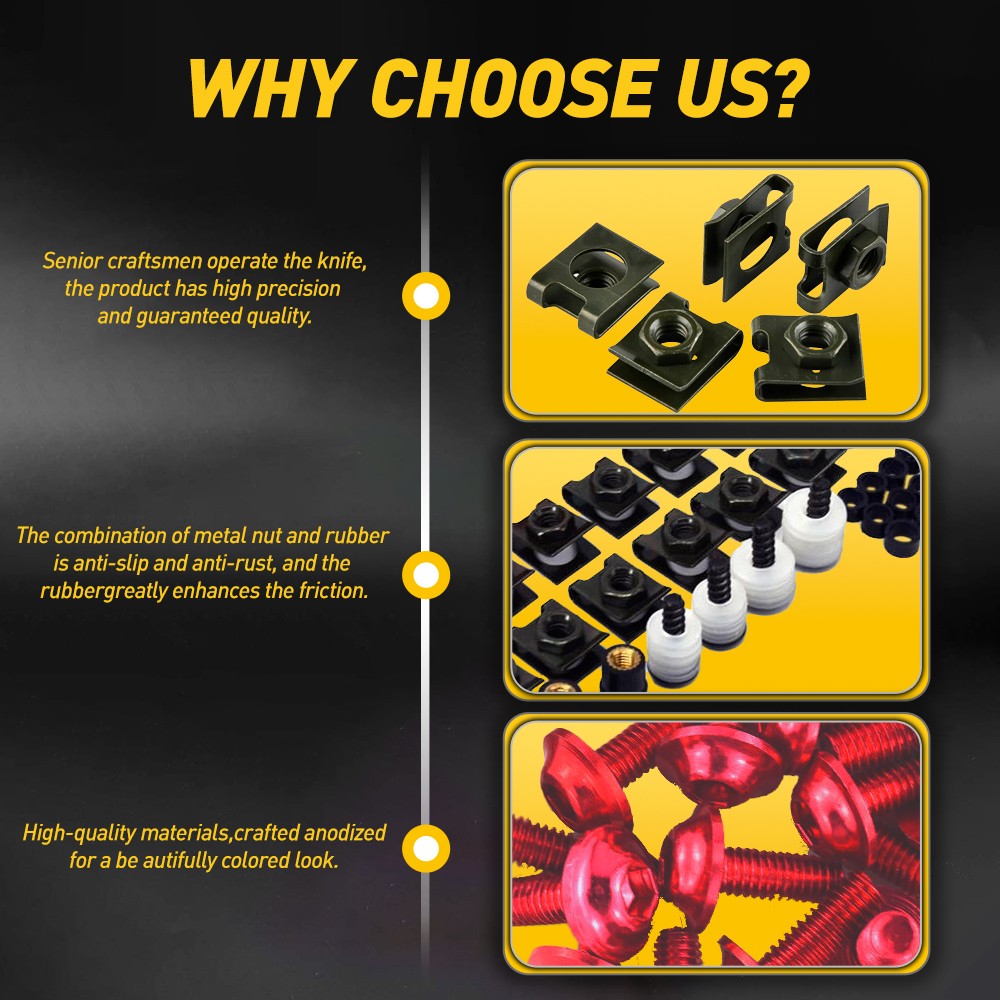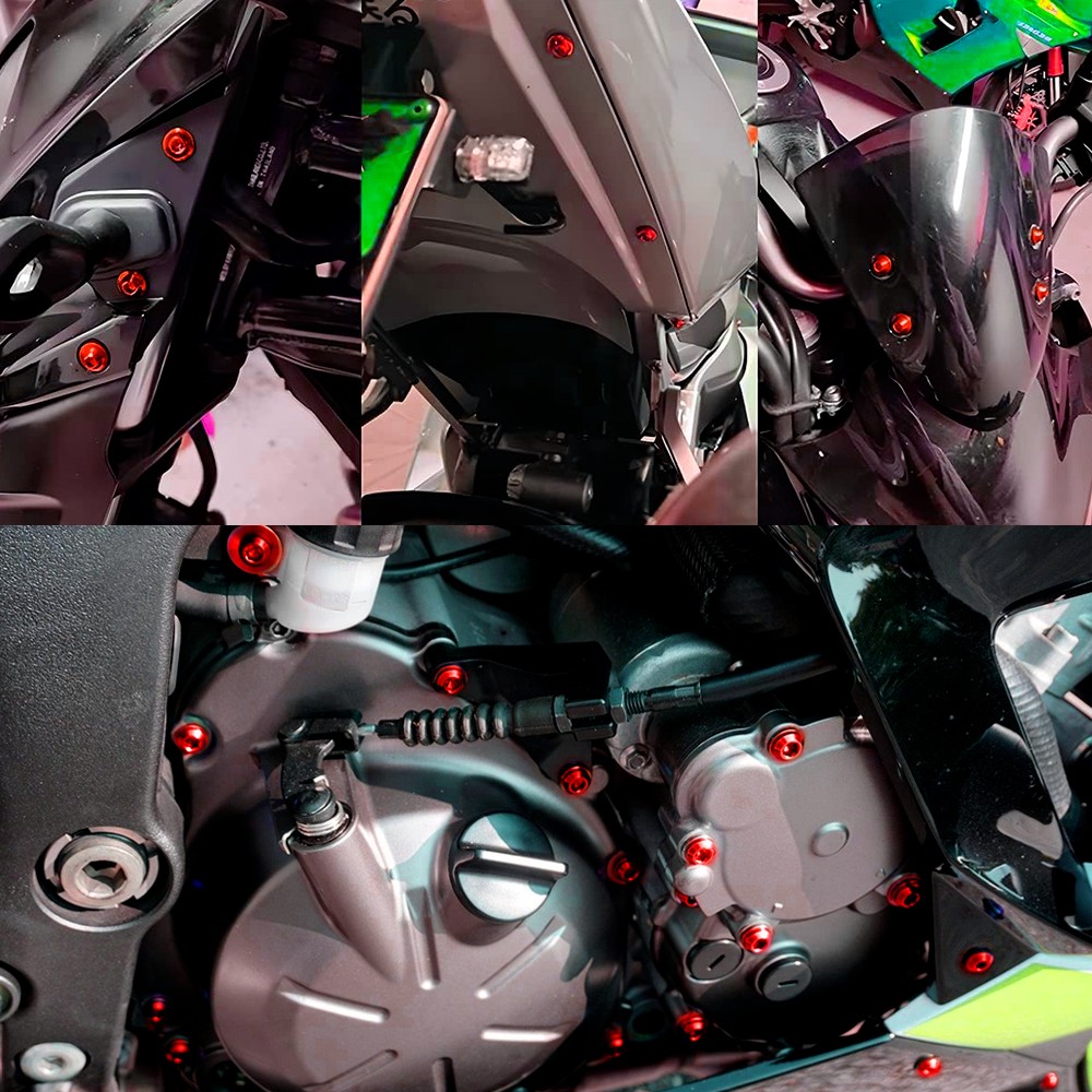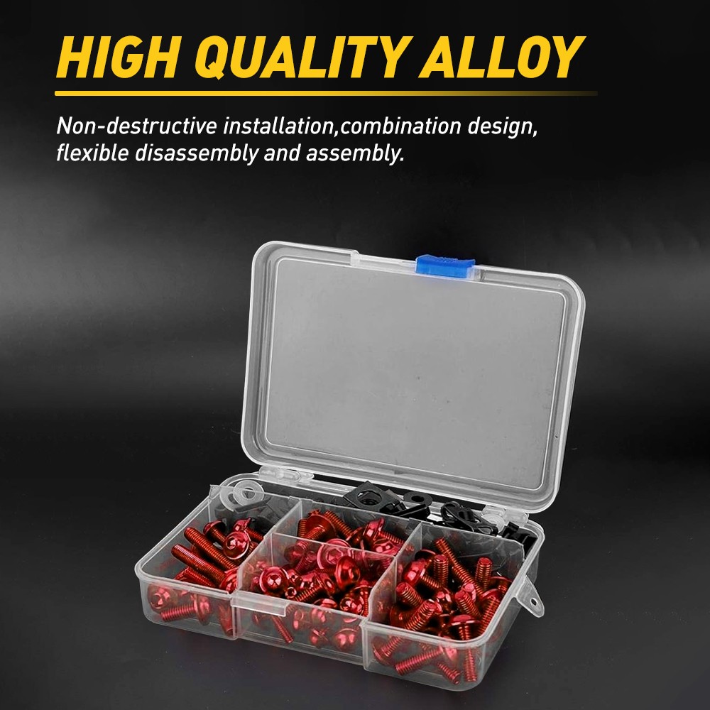 Our bolt kits are made of high-quality aluminum, are extremely strong and durable, and have a long-lasting shine.  High-quality aluminum screws is rustproof, and anodized surfaces prevent them from corrosion.  Nine colors are available, and you can match them to your motorcycles to make them a little cooler.