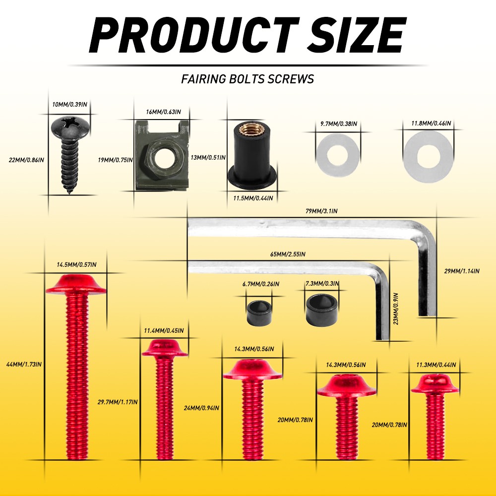 This is a motorcycle replacement part, the accessories of the body bolt kit are designed in standard size, basically suitable for most sports motorcycles on the market, so that your motorcycle catches people's attention in details.  This kit will fit most motorcycles, but it's better to check if the size is right before buying.