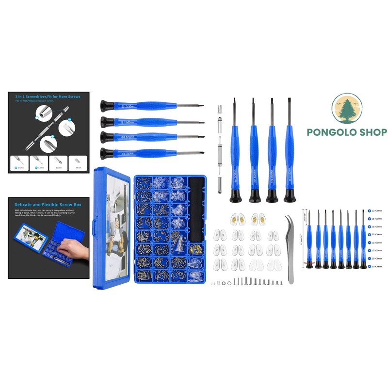 - Features: Compact, Complete Eyeglass Repair Kit, Precision Screwdriver Set, Various Nose Pads, Tiny Screws, Curved Tweezer, Convenient Screw Box, Lightweight, Portable
