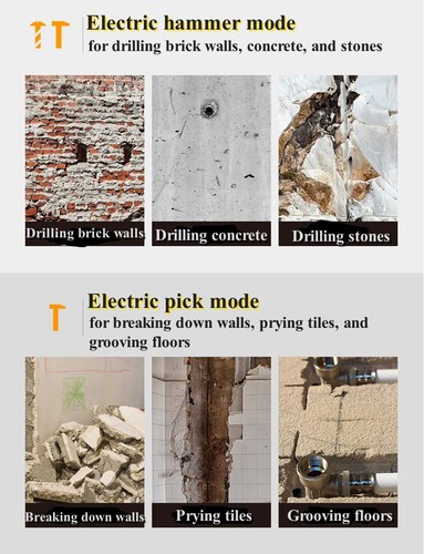 Two Modes: By rotating the button and purchasing the corresponding electric drill, you can easily switch two working modes. The electric hammer mode is suitable for drilling brick walls, concrete, and stones, while the electric pick mode is suitable for breaking down walls, prying tiles, and grooving floors, making it meet your various needs and reducing the hassle of preparing multiple tools.