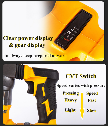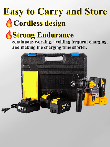 Are you looking for a high-quality and powerful cordless rotary hammer drill? This product will win your favor! It adopts a brushless pure copper motor, alloy, and steel, ensuring high hardness, strong compression resistance, and strong power. The two modes of electric hammer and electric pick can meet your various needs and ensure accurate and efficient work. The long battery endurance and comfortable handle can meet long-term use, greatly improving your work experience. It will be a good helper in your work!