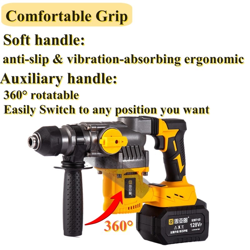 Comfortable Grip: The anti-slip and vibration-absorbing ergonomic soft handle and the 360° rotatable auxiliary handle can decrease the vibration to your hands, greatly reducing fatigue and strain to your hands, ensuring a more comfortable and flexible grip.