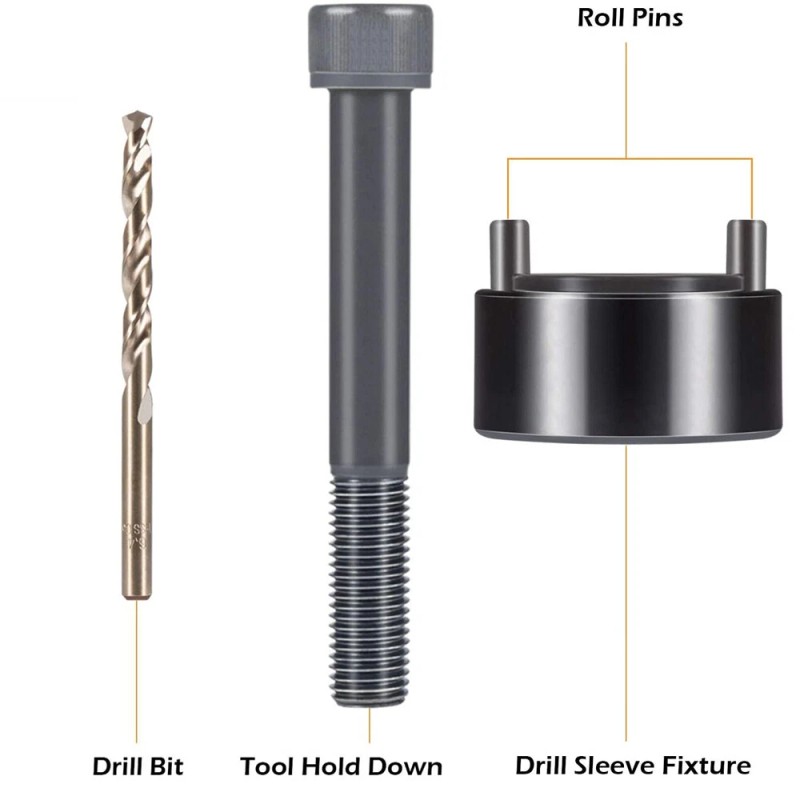 【PACKAGE INCLUDES】1×drill sleeve fixture, 1×drill bit, 1×tool hold down bolt, 2pcs 1/4" diameter roll pins.