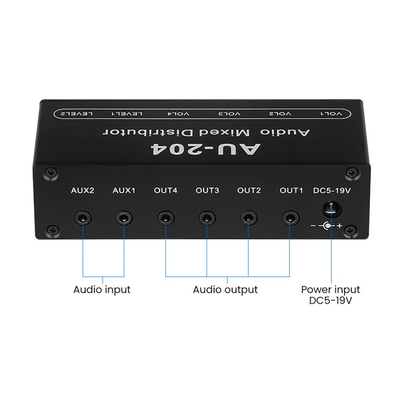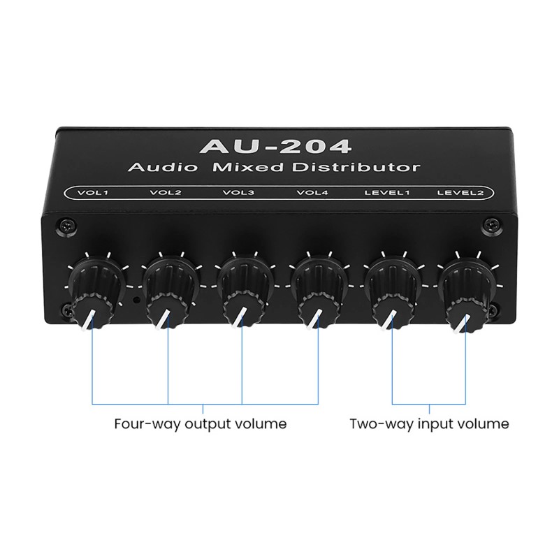 Stereo audio two-way input four-way output, can directly push four headphones or external amplifiers do not affect each other,
