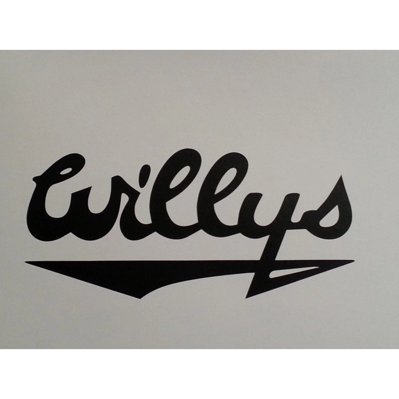 WILLYS LOGO SCRIPT VINYL DECAL.  BLACK LETTERS. APPROX. 2" X 5-1/2"