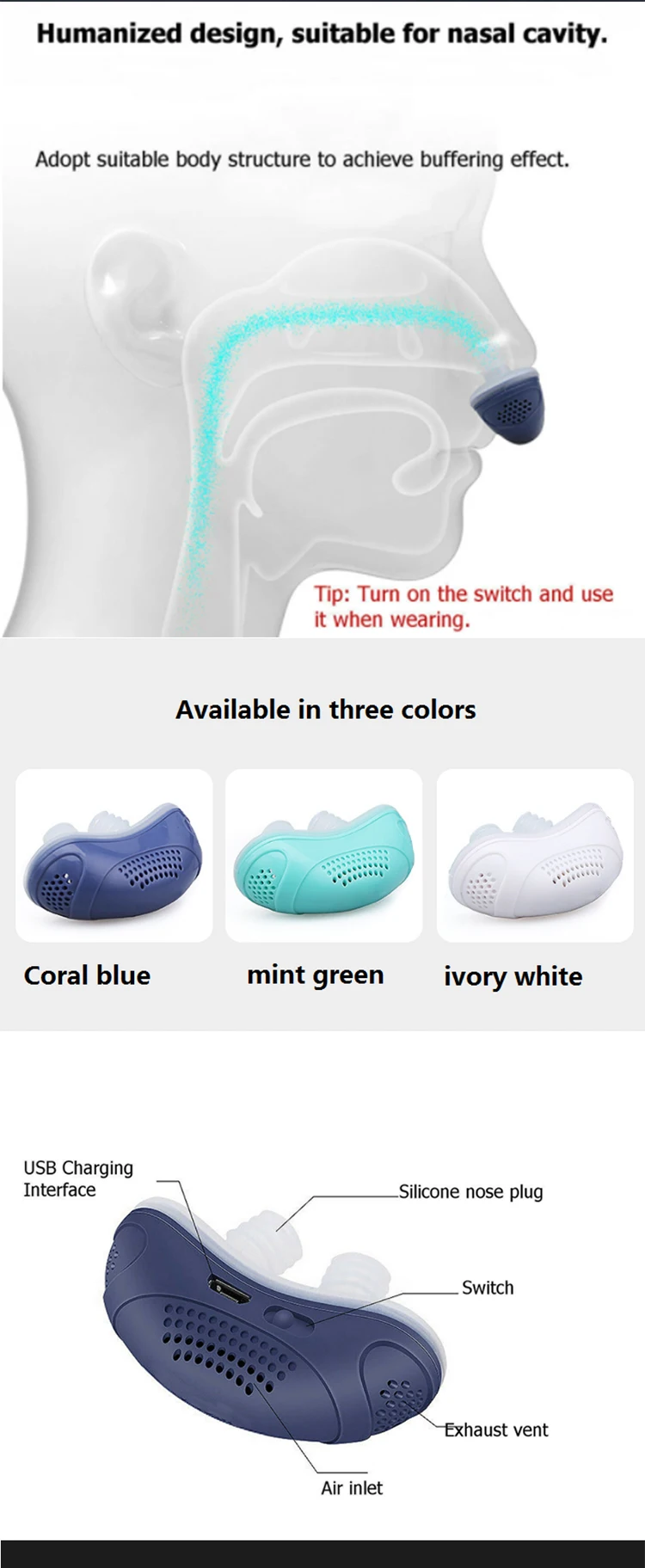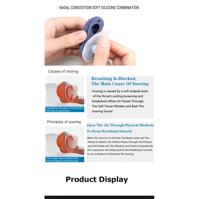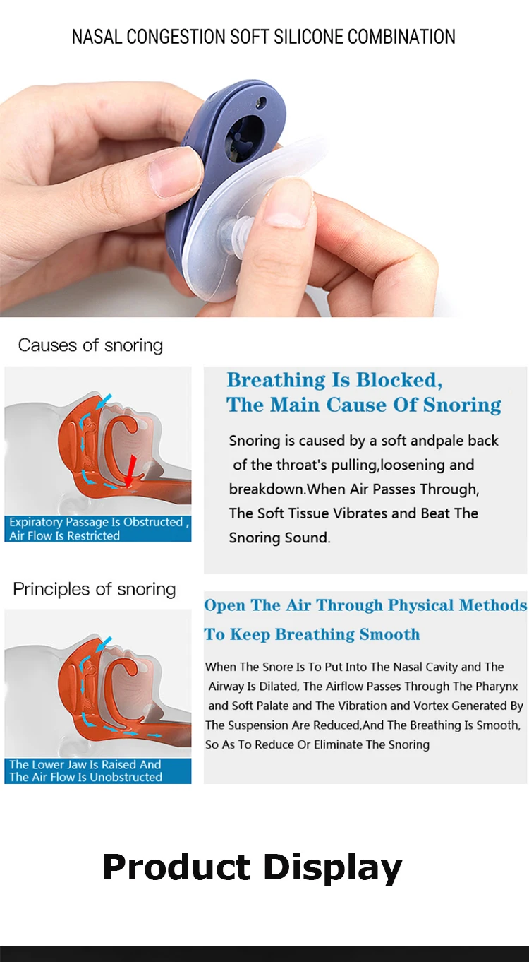 - Principle of stopping snoring: Put the snoring device into the nasal cavity. After the airway is expanded, the airflow passes through the pharyngeal cavity and soft palate, reducing the vibration and vortex generated by the uvula, making breathing smooth, thereby reducing or eliminating snoring.