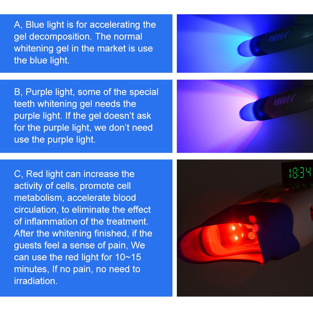 - High-efficiency and high-power blue lights enhance the effectiveness of the whitening gel, ensuring a superior result.