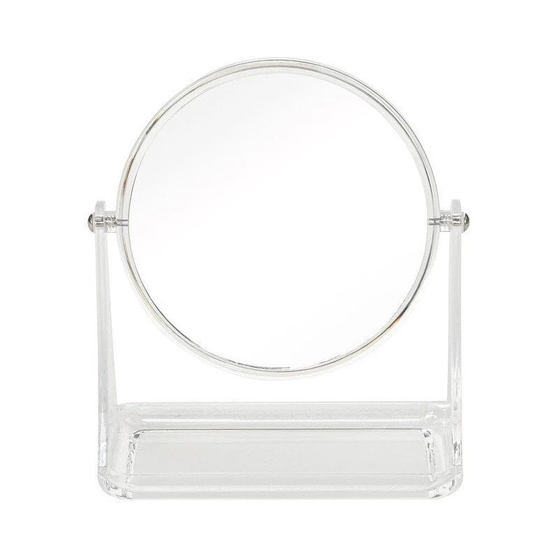 Measures: 7” x 3. 54” x 7. 87” highDurable plastic frame in clear finishRound 5. 5” diameter mirror made from quality glass