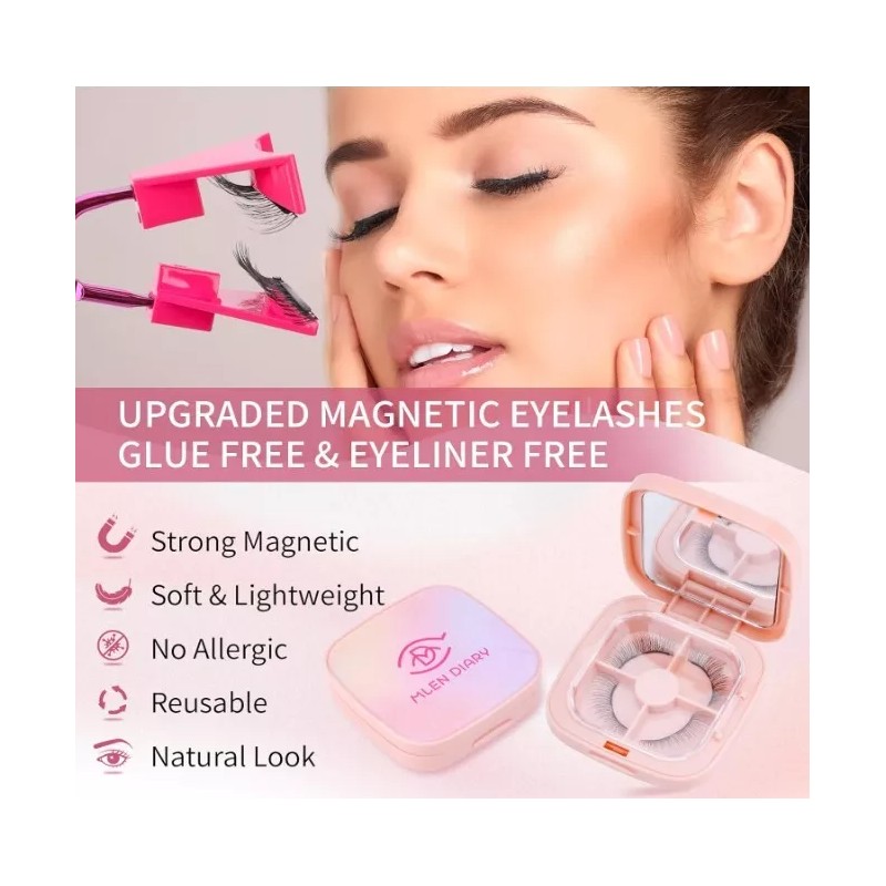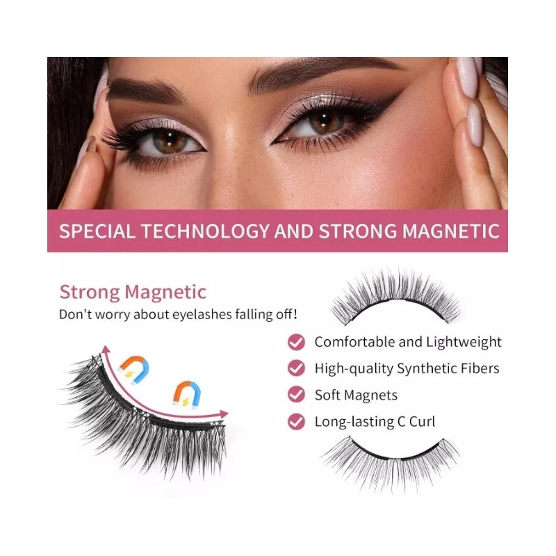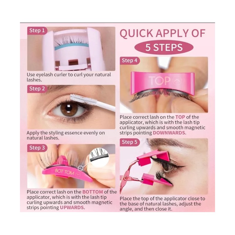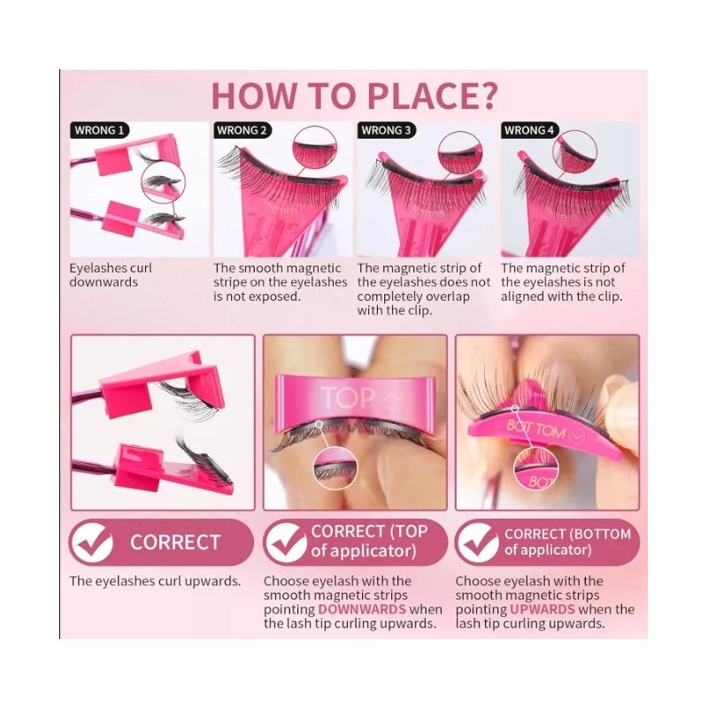 • 【QUICK APPLY & NO GLUE NO EYELINER NEEDED】Compared with traditional lashes, the most obvious advantage is that there is no glue and eyeliner, and you can quickly apply eyelashes in just three steps. Simply place the two lashes correctly on the TOP and BOTTOM of the applicator and close the tool at the right angle, and the magnetic lashes will firmly attach to your natural lashes. Minimize your makeup time!