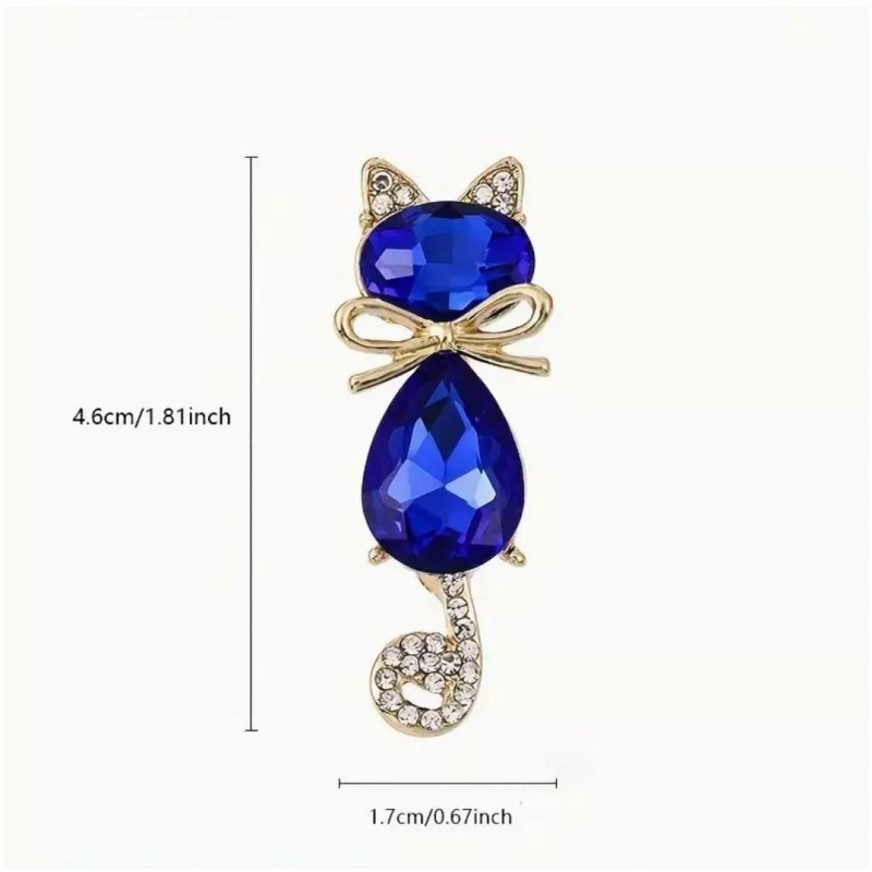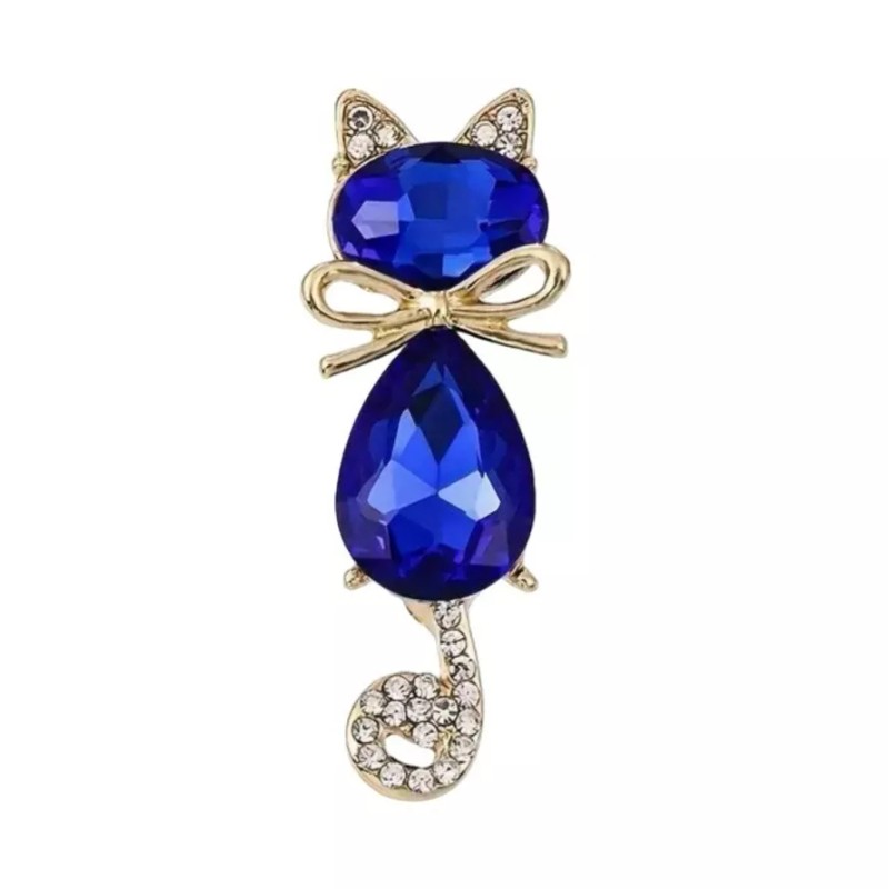 Unbranded Elegant Cobalt Blue Gemstone Cat Brooch Pin With Crystal Accents