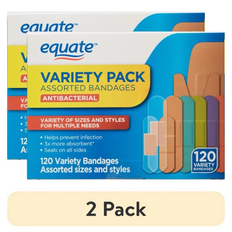 Complete your first aid kit with bandages in variety of sizes and styles for your multiple needs with Equate Antibacterial Assorted Bandages Variety Pack. This pack includes 120 antibacterial bandages in assorted shapes and sizes. The active ingredient of benzalkonium chloride acts as an antibacterial agent that helps prevent infection. Useful for minor cuts, scrapes and burns, the lasting adhesive keeps the bandages in place throughout the day and seals the wound from all sides. The wound pads are three times more absorbent, while the knuckle bandages fit easily around finger joints. They are flexible and stretchable, so they move along with your body. The pack also includes 30 waterproof bandages in two different sizes. Bring home Equate Antibacterial Assorted Bandages Variety Pack today!