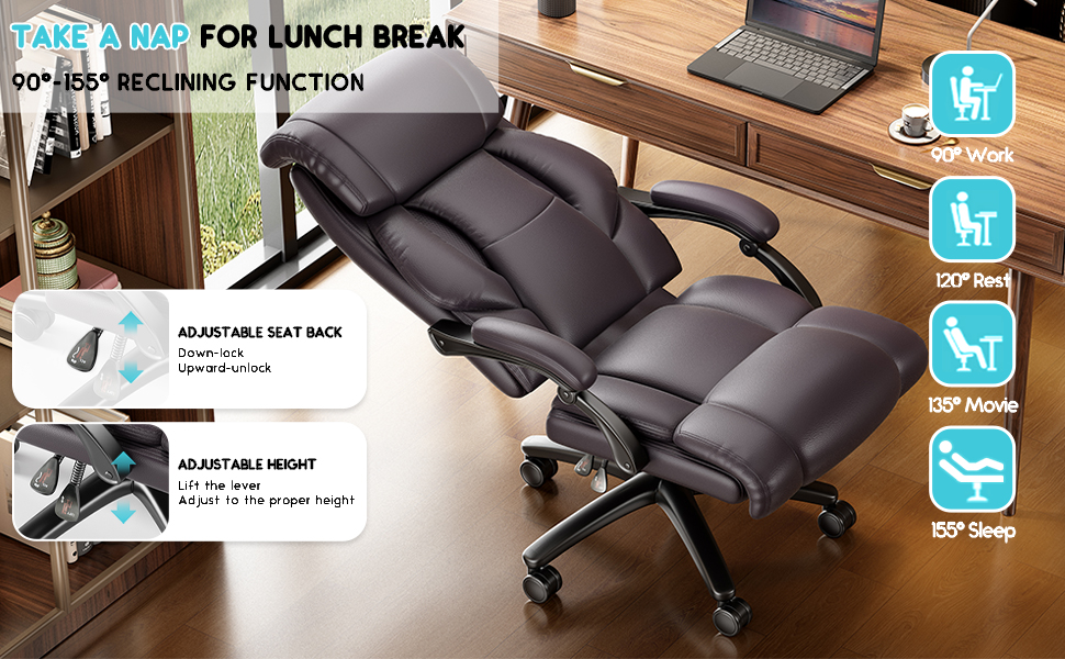 ✌ [Fully Adjustable Features]This high-back reclining office chair features a 360° swivel, 90-160° back adjustment, and adjustable seat height. The lock mechanism allows you to recline and relax whenever needed. Thickened linkage armrests help relieve arm pressure. Whether you need a quick break or want to continue working comfortably, this chair adapts to your needs.