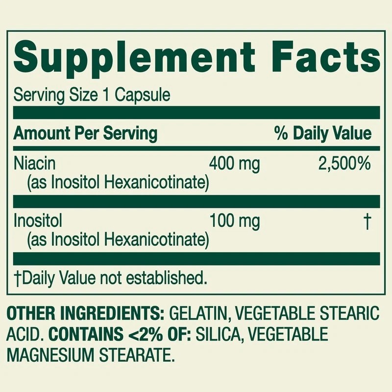 - Ingredients: Niacin (Vitamin B3), Inositol Hexanicotinate