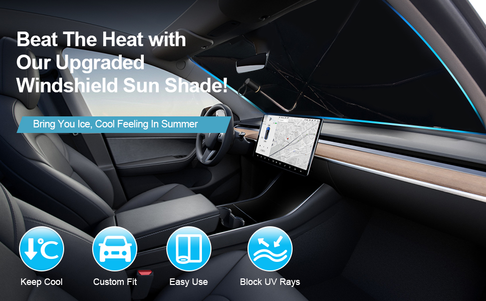 2. Universal Compatibilty - This sunshade is 141.4x76.7cm, or approximately 55.67x30.2 inches (length x width). The large size makes it suitable for most of cars, vans, sedens, trucks, etc whose sizes of windshields or windscreens are approx. equal to that of umbrella. Thus, please confirm the size before you place the order.