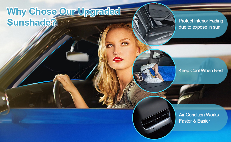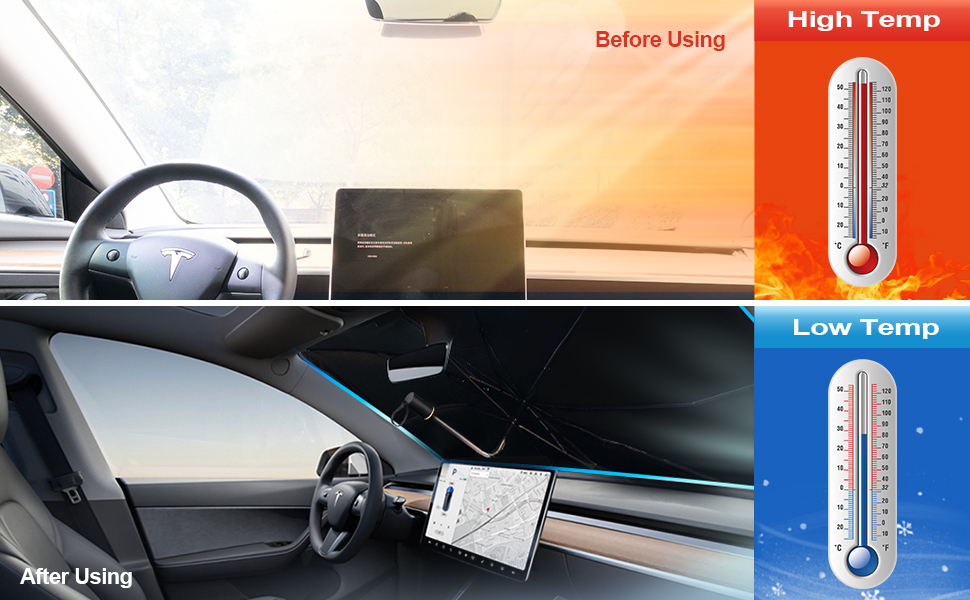 1. High-Quality Material & Durable Design - This umbrella is made of silver coated cloth and black steel bone. These types of materials ensure the reliability and durability of this car sunshade umbrella. Its design - the silver coating and black back can efficiently protect the interior of your car from UV rays, sun glare, to lower the temperature in the car, which makes you comfortable.