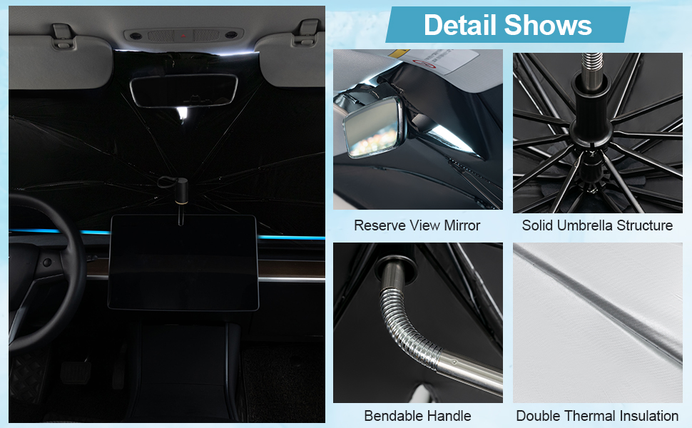 3. Certain Upgraded Designs For The Umbrella - First, a slot is designed on the upper side of the umbrella. With this slot, it can perfectly fit for the windshields or windscreens with rear view mirrors. Second, the unique idea - 360 degrees rotatable and bendable umbrella knob - is taken. The umbrella knobs of most of car sun umbrellas can't be rotated at 360 degrees and bendable. However, the umbrella knob of our car sun umbrella is made from soft plastic and can be 360 degrees rotatable and bendable, which better protect your car center console and dashboard from being scratched.