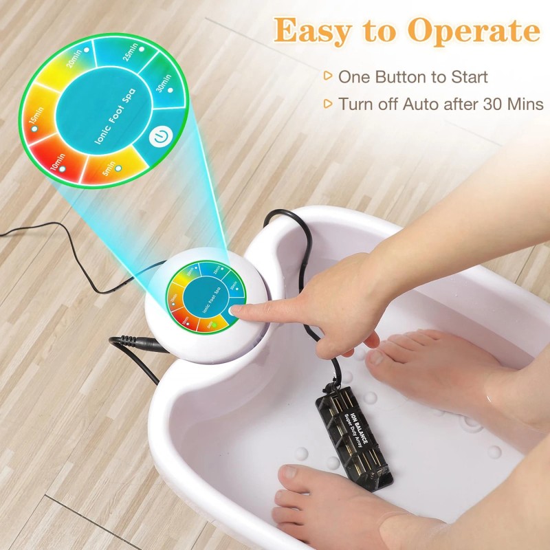 * Easy to Use Foot Detox Machine: Worry-free use for the elderly. Plug and play. Just plug into the outlet of the foot detox machine, and touch the sensitive On/ Off button, then submerge your feet in a basin of water paired with an upgraded array.