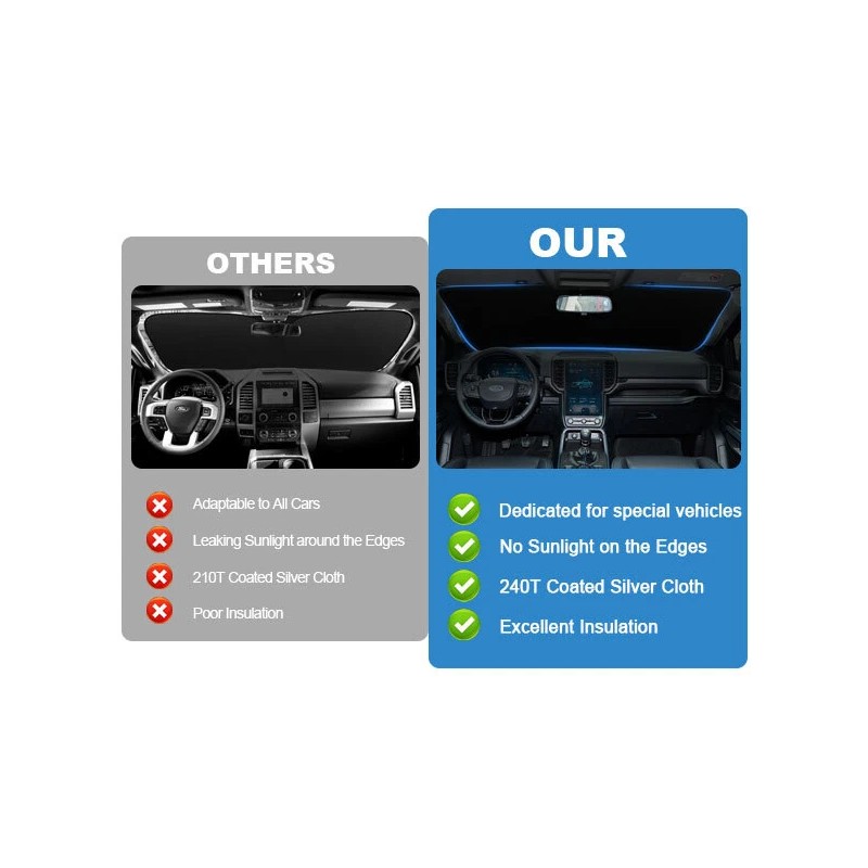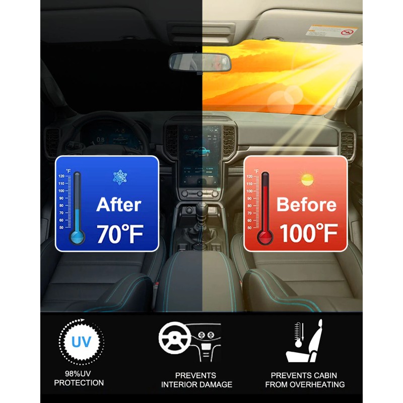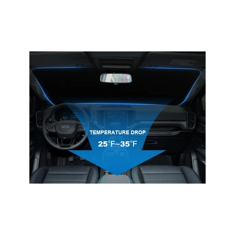 Superior Sun Protection —— Made with multi-layer reflective material, it blocks up to 99% of UV and IR rays, reducing interior heat and protecting your dashboard from cracking or fading.