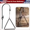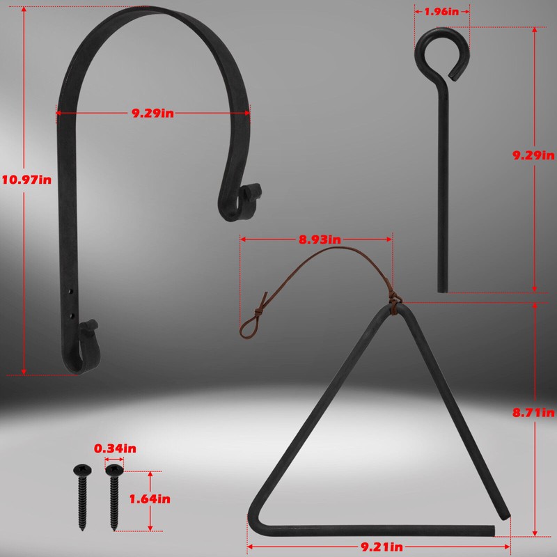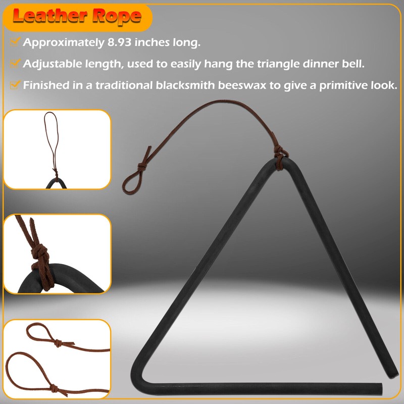 - 【Package Includes】1 x Triangle Dinner Bell, 1 x Call Striker, 1 x Mounting Hook with Tapered Hand Scrolled Ends, 1 x Leather Rope for Hanging, 2 x Mounting Screws.