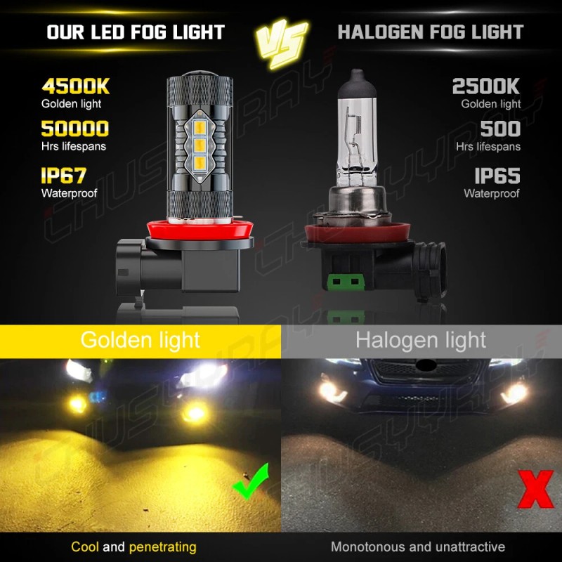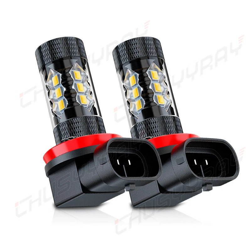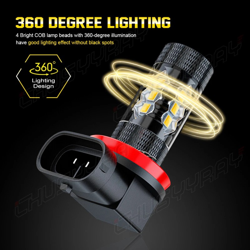 Each of these fog Light bulbs is powered by 16 pieces of super bright 2835-SMD LED chips, 12 pieces on each side and 4 pieces on the top with 3x Magnifying Projector Lens.