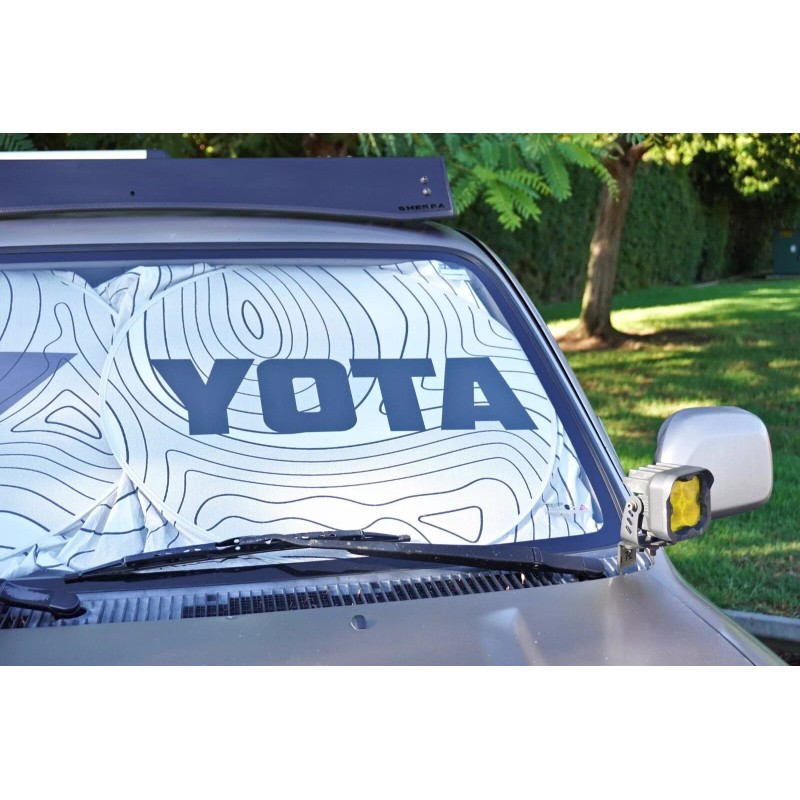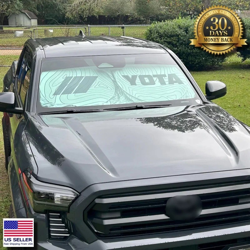 Fit for Toyota RAV4 and others. Size is 59.05 inches by 27.55 inches tall. Our custom Topographic Map TRD inspired Windshield Sunshade uses advanced UV blocking Titanium Silver Coating to protect against the most extreme and damaging levels of heat and ultraviolet rays. Whether you're parked at the mall or the mountainside, keep your car cool, protected, and breathe easier when you return to drive. Stand out from the pack. Crafted for the Toyota enthusiast. FREE SHIPPING for U.S. based buyers.