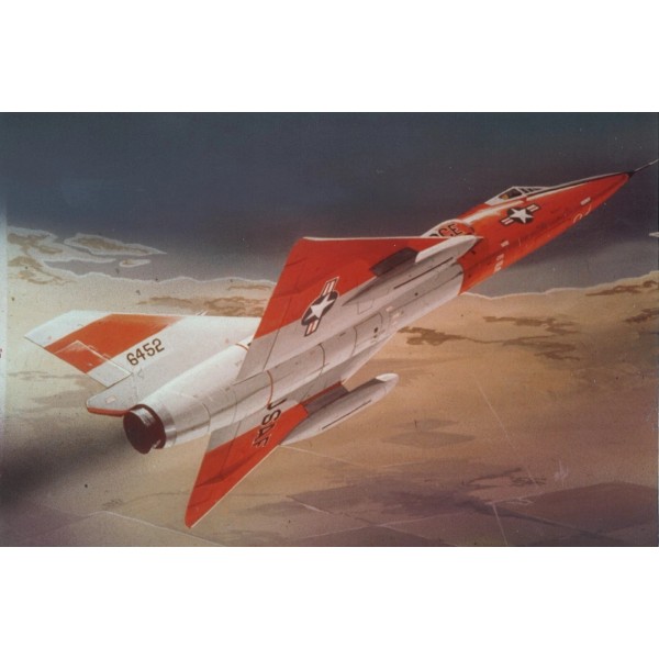 This is a framed 4" X 6" print of a painting of a Convair F-106A "Delta Dart". The painting is detailed and accurately portrays this important US military aircraft.  The F-106 was the main all-weather interceptor used by the USAF from the 1960' thru the 1980's. The wooden military green frame measures 6.5" X 8.5" and has a routered piece for hanging.  A mounting screw and a dowel for displaying the frame on a shelf or desk is included.