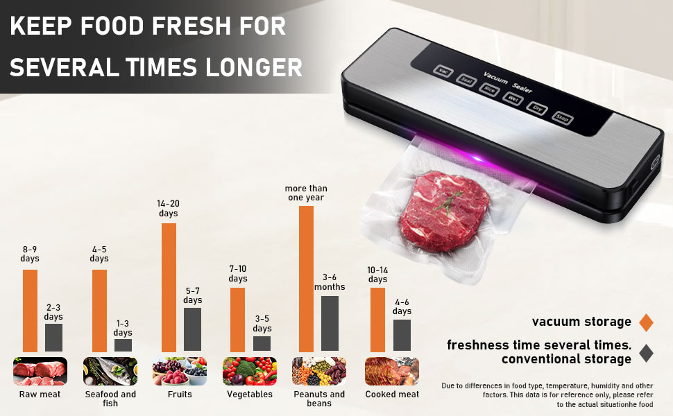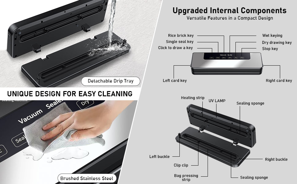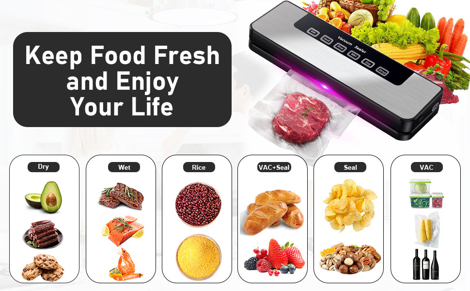 |  Vacuum Sealer Operating Modes Explained: Dry Suction Key: (low temperature) The dry suction indicator light is on, suitable for dry items. Wet Suction Key: (medium temperature) The wet suction indicator light is on, suitable for moist food (no obvious liquid in the bag). Rice Brick Key: (high temperature) The rice brick indicator light is on, suitable for bags with folded edges on both sides or thick bags. Single Seal Key: Press this key to automatically complete the single seal function. (It is recommended to restart after 20 seconds) to extend the life of the heating wire. Spot Suction Vacuum Key: Hold this key to vacuum, release to stop (manual control of vacuum degree). Stop Key: Press this key to stop operation during work. Spot suction + single seal = manual control of vacuum sealing, suitable for soft food or food with obvious liquid in the bag.  Features: