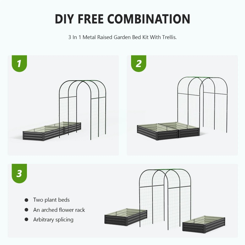【3 IN 1 Raised Garden Bed with Trellis】:Our Raised garden bed kit comes with 2 raised garden beds, one 85inch tall garden arch trellis for climbing plants, paired with climbing net for support, making it a comprehensive gardening solution. Upgraded design provides you with convenience and affordability.
