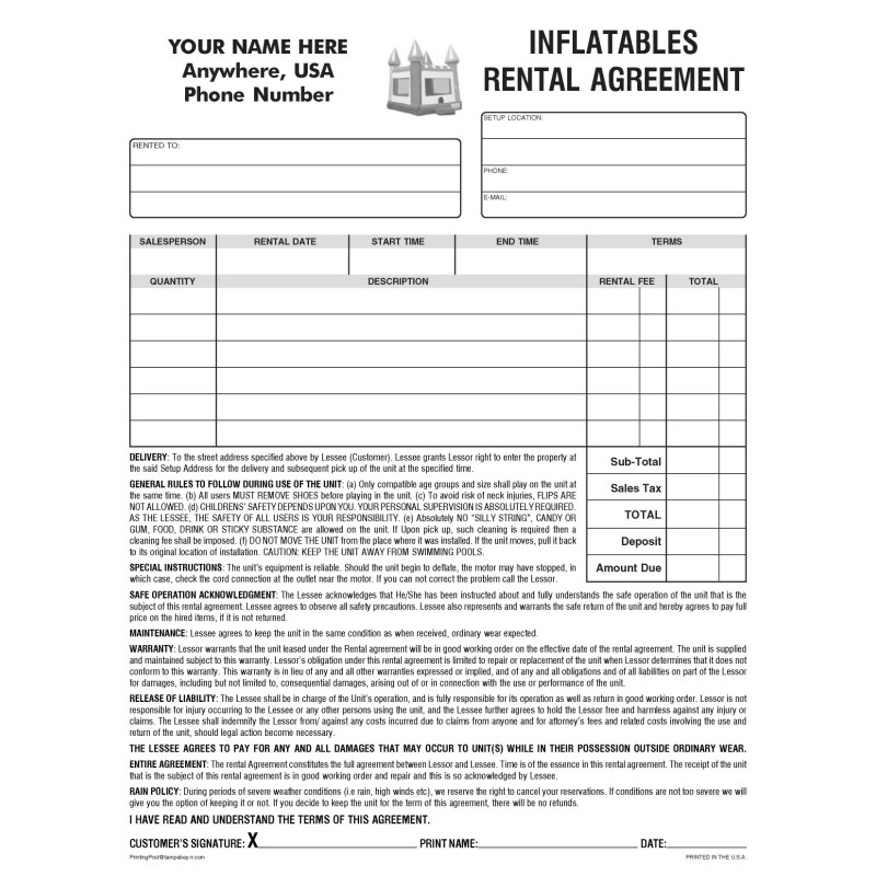 Unbranded/Generic 100 Inflatables Bounce House Party Rental Agreement 2-part ...