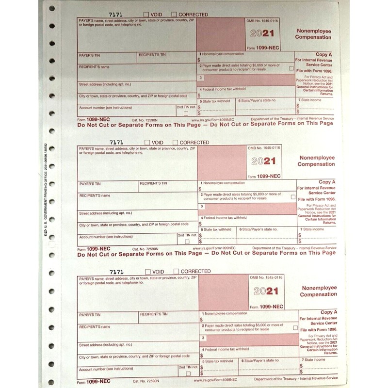 Six (6) 1099-NEC Tax Forms (2 sheets) for Tax Year 2021 ~ NOTE: There are three 1099-NEC forms per sheet